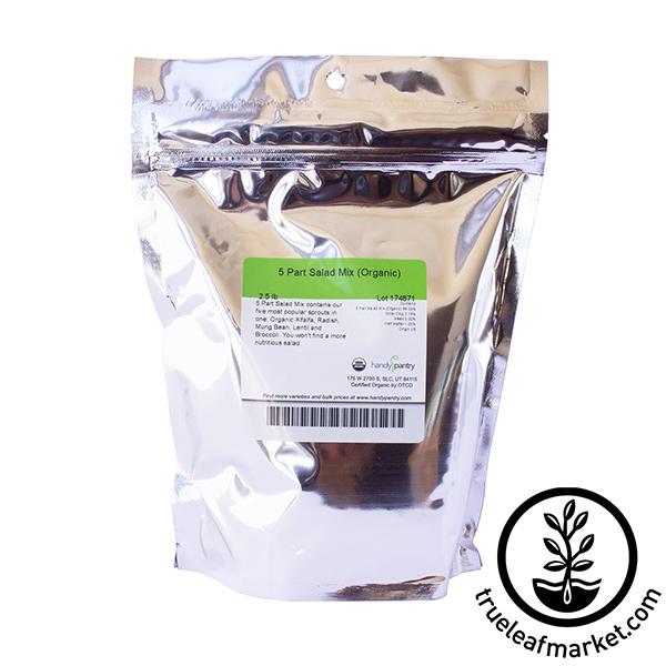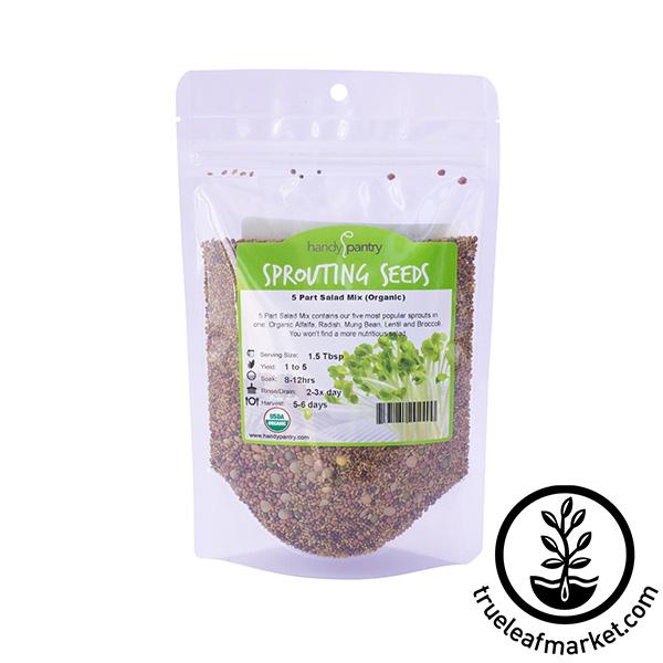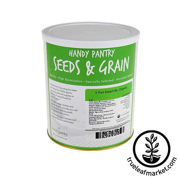 5 Part Sprouting Seed Mix with Radish, Broccoli, Green Lentil, Mung and Alfalfa seeds mixed together for a perfect salad mix. Our all time most popular sprouting seed mix. Sprouts are easy and fun to grow and very healthy. Certified organic seeds by Handy Pantry.