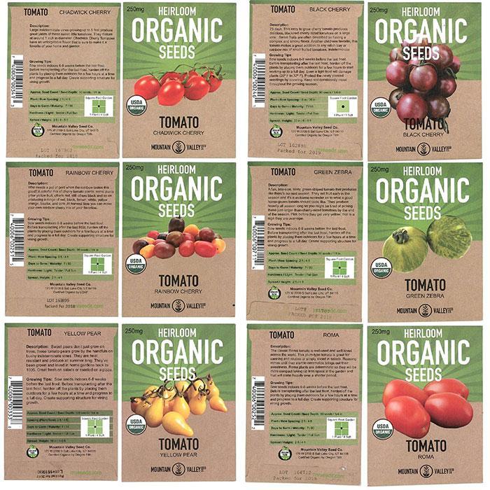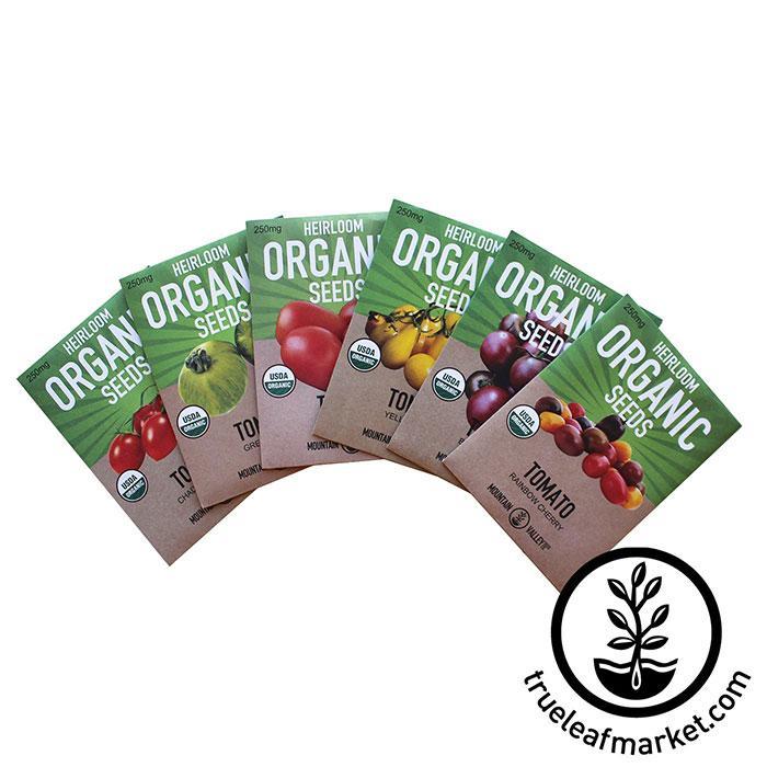 Stunning collection of certified organic, heirloom cherry tomato seeds. A veritable rainbow of cherry tomatoes. Tomato seeds include: Yellow Pear, Chadwick Cherry, Black Cherry, Rainbow Cherry, Roma & Green Zebra.