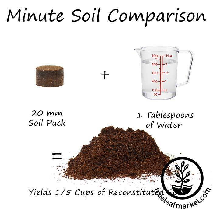 - 20 MM Minute Soil Pellets - Bag of 100 - Add 1 tablespoon of water to each pellet to re-hydrate - Expands up to 15 times - Yields approx 1/5th cup of soil per pellet - Full bag re-hydrates to approx 5 quarts of soil.