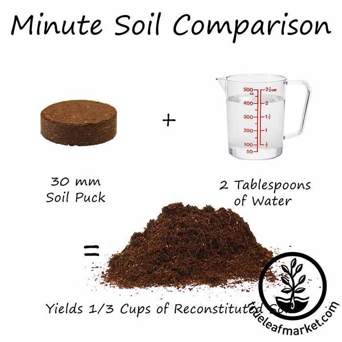 - 30 MM Minute Soil Discs - Bag of 70 - Add 2 tablespoons of water to each disc to re-hydrate - Expands up to 15 times - Yields approx 1/3rd cup of soil per disc - Full bag re-hydrates to approx 5.75 quarts of soil.