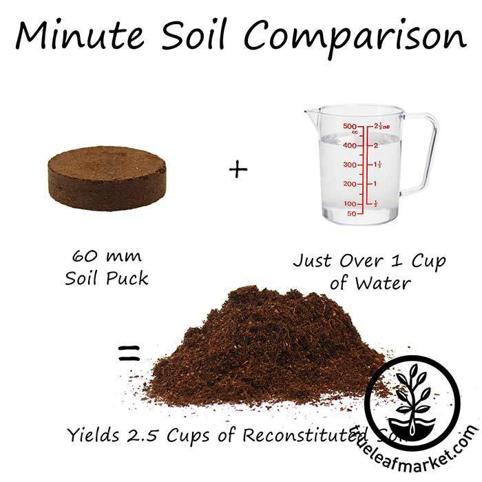 - 60 MM Minute Soil Discs - Roll of 10 - Add just over 1 cup of water to each disc to re-hydrate - Expands up to 15 times - Yields approx 2.25 cup of soil per disc - Full roll re-hydrates to approx 5.5 quarts of soil.